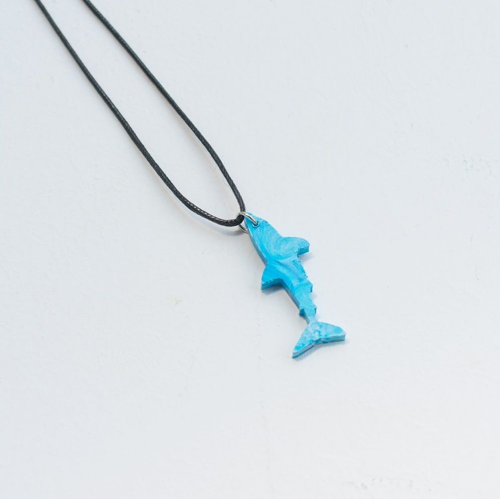 The Precious plastic shark necklace was made using the precious plastic recycling machines. The Precious Plastic machines where made by David Hakkens who built the machines and released their blueprints to the world in the hope that people replicate his machines all around the world.